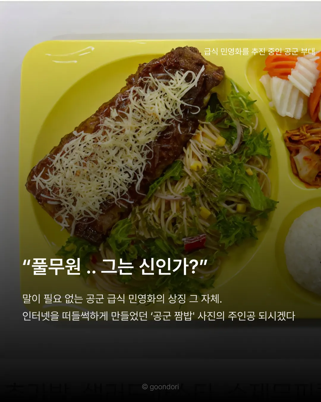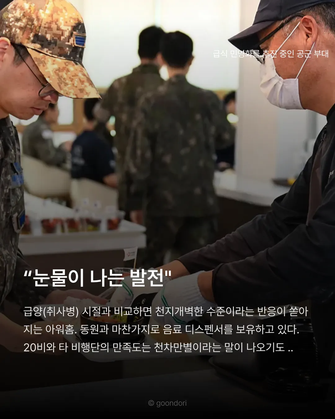 공군은 육·해·공 3군 중 이 수혜를 가장 많이 받고 있는 집단으로, 민영화를 추진 중인 부대의 급식은 더이상 짬밥이라고 부를 수 없는 수준의 퀄리티를 보여주고 있었습니다.