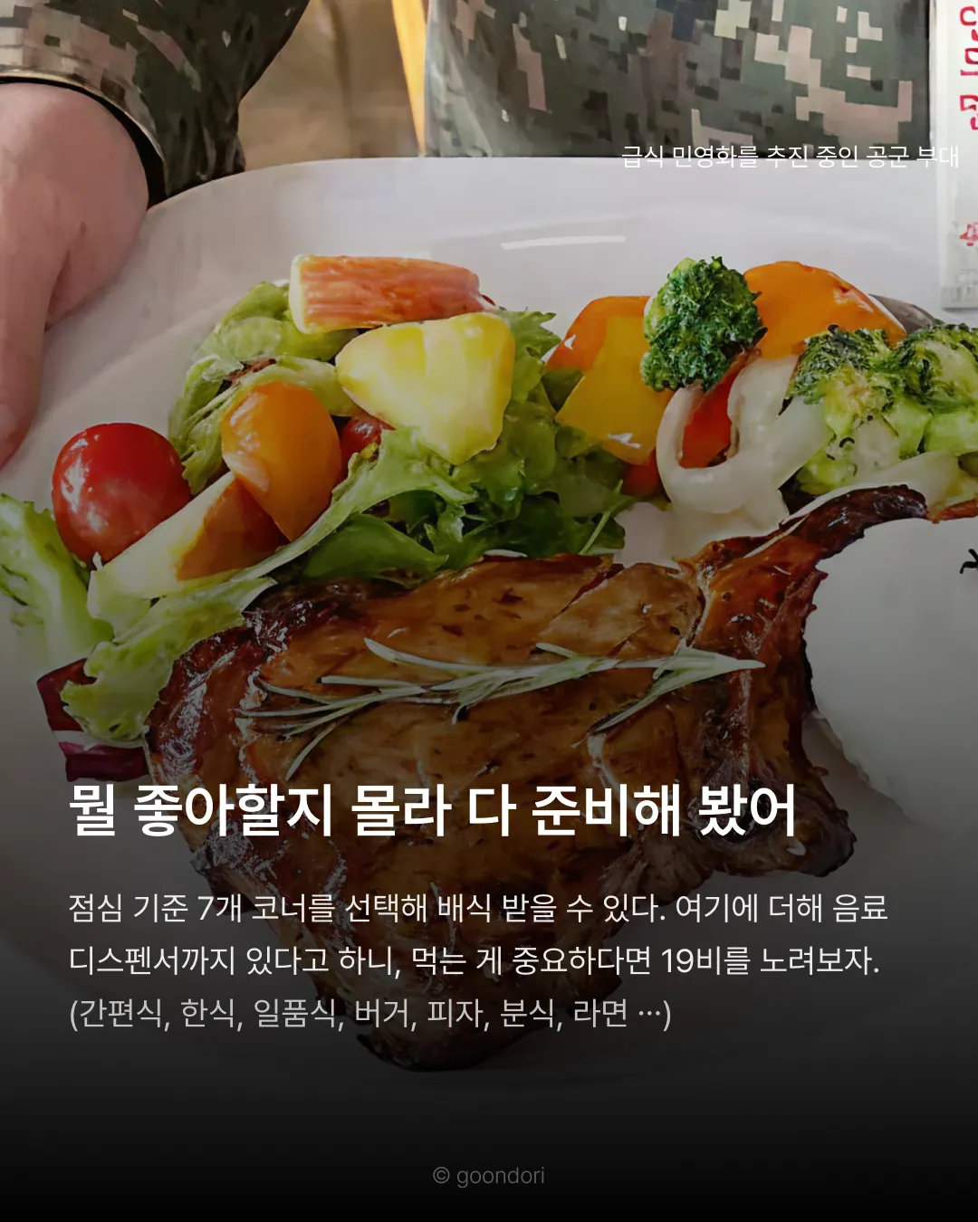 국방부 역시 밥심의 중요성을 인지하고 있는 듯 급식 민영화 부대를 점차 확대해 나갈 계획이라고 밝혔었어요.