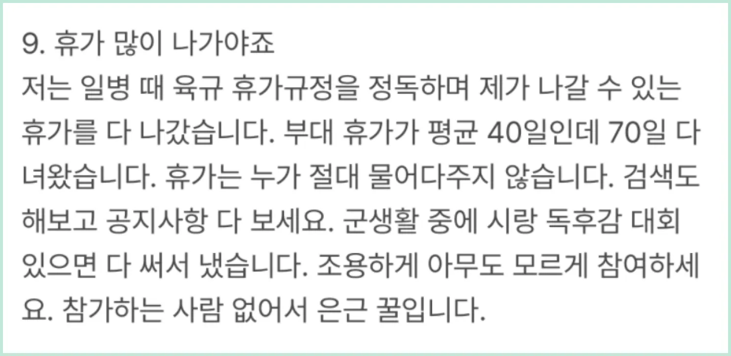 필자는 일병 때 육군 휴가 규정을 정독하며 나갈 수 있는 휴가란 휴가는 다 나갔다.