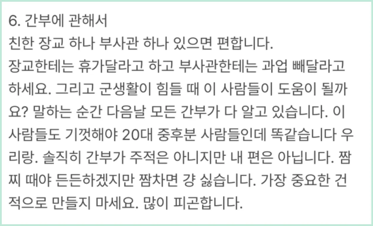 친한 장교 · 부사관 한 명씩 있으면 편하다. 장교한테는 휴가를, 부사관한테는 작업 열외를 얻어낼 수 있다.