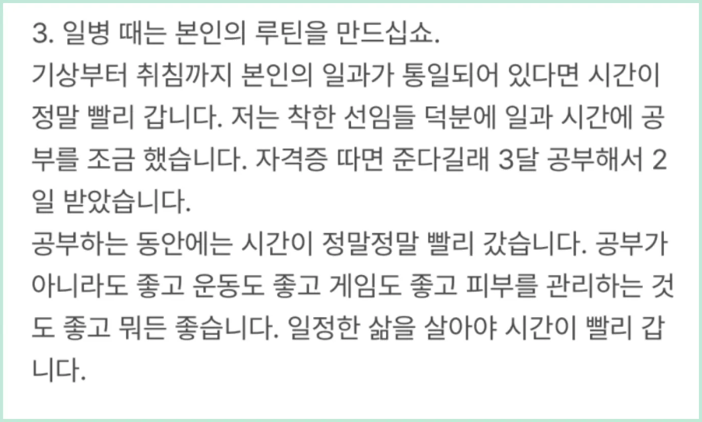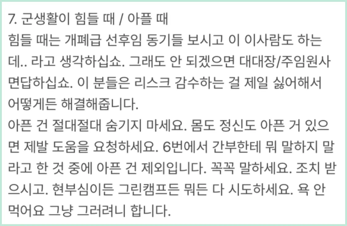 힘들 때는 폐급 선후임 · 동기를 보면서 ‘아 이 사람도 하는데 ..’ 생각하면서 버티자.