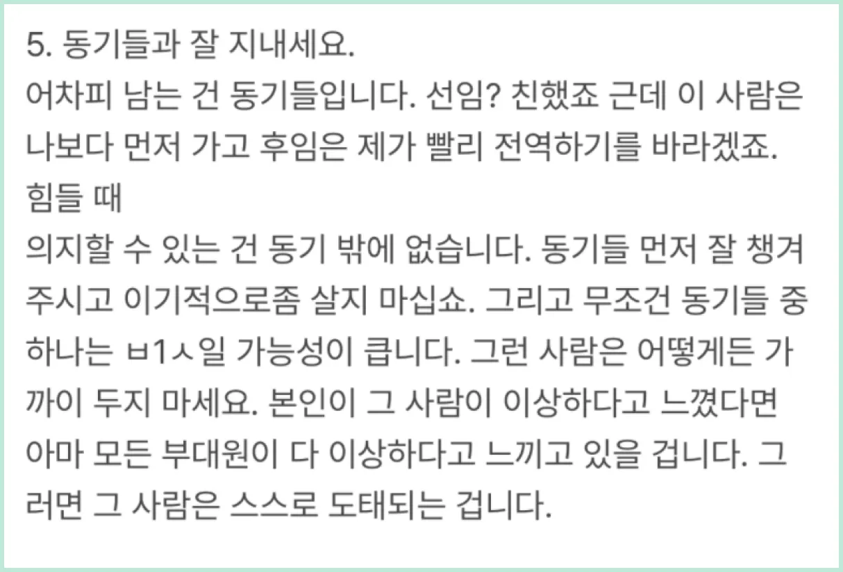 동기들부터 잘 챙기고, 이기적으로 살지 말자. (물론 폐급 동기는 예외다)