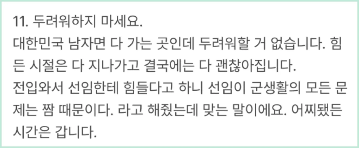 대한민국 남자라면 누구나 다 가는 곳이 군대다. 두려워할 거 없다. 버티면 힘든 시절은 다 지나가고, 결국에는 다 괜찮아진다.