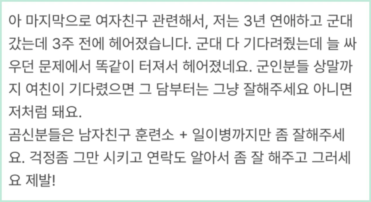 상말까지 여친이 기다려줬으면 그냥 잘 해줘라. 아니면 본인처럼 다 기다려줬는데 전역 3주 전에 헤어진다.