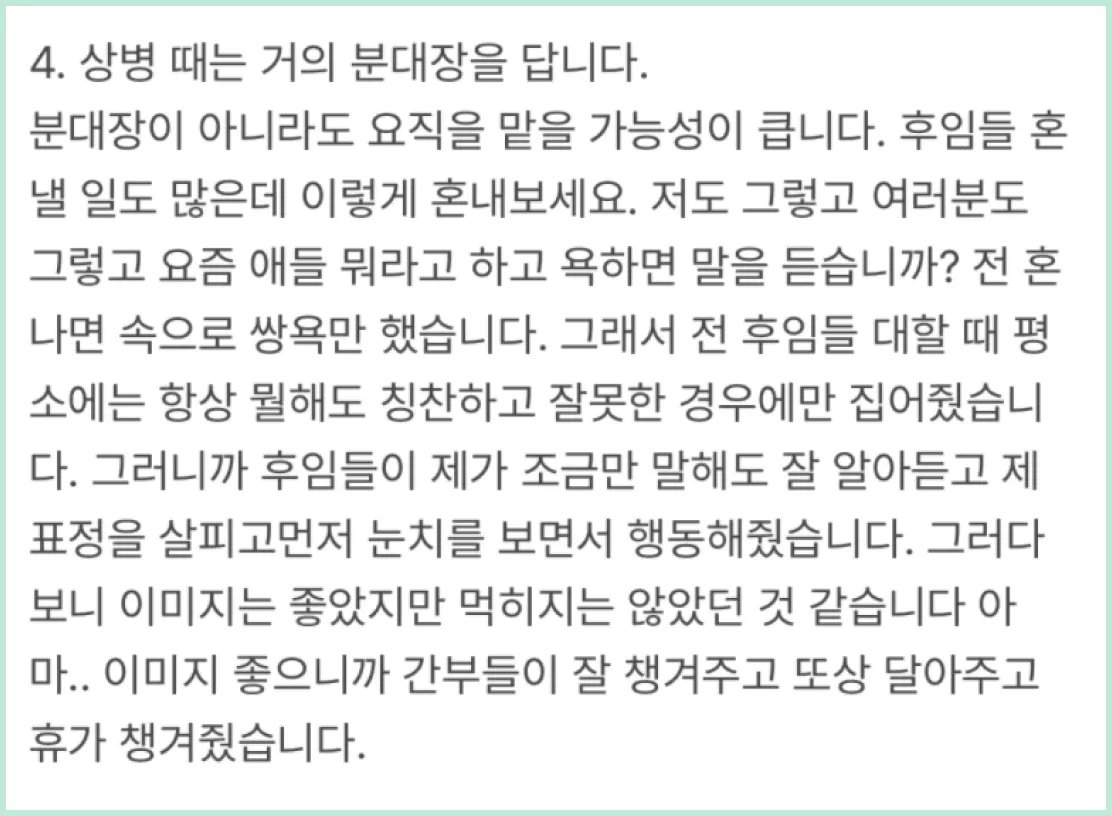 평소에는 자그마한 것 하나에도 칭찬해 주고, 정말 잘못한 경우에만 집어주자. 후임들이 알아서 잘 하려고 할 거다. 이미지 좋아지는 건 덤이다.