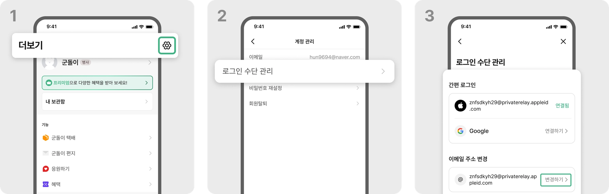 설정 > 계정 관리 > 로그인 수단 관리 > 이메일 주소 변경을 이용해 새 이메일 주소로 변경해 주세요.